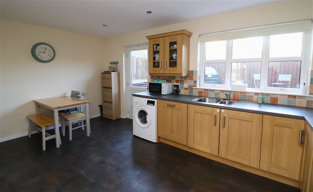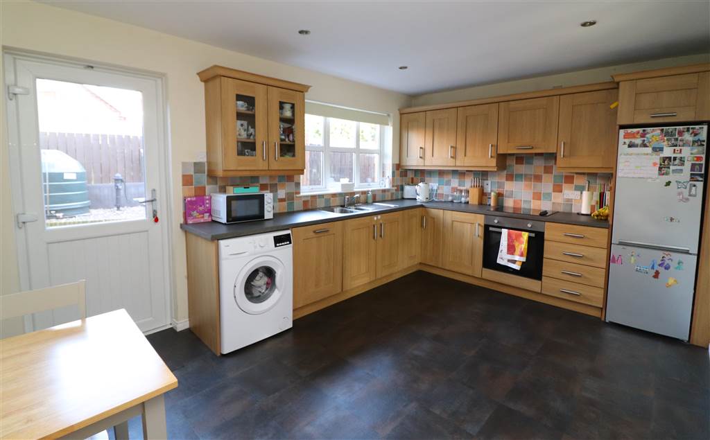 Good range of high and low level units. One and a half bowl stainless steel sink unit with mixer taps. Plumbed for dishwasher. Space for fridge/freezer. Built in hob and under oven. Cooker filter. Recessed lights. Part tiled walls.