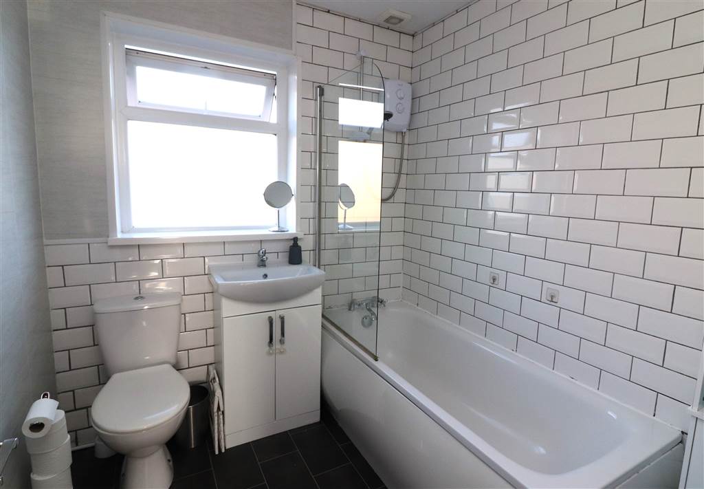 White suite. Panelled bath with mixer taps, Triton electric shower and shower screen. Vanity unit with wash hand basin. Low flush WC. Heated chrome towel rail. Extractor fan. PVC panelled and tiled walls. PVC panelled ceiling with recessed lights.