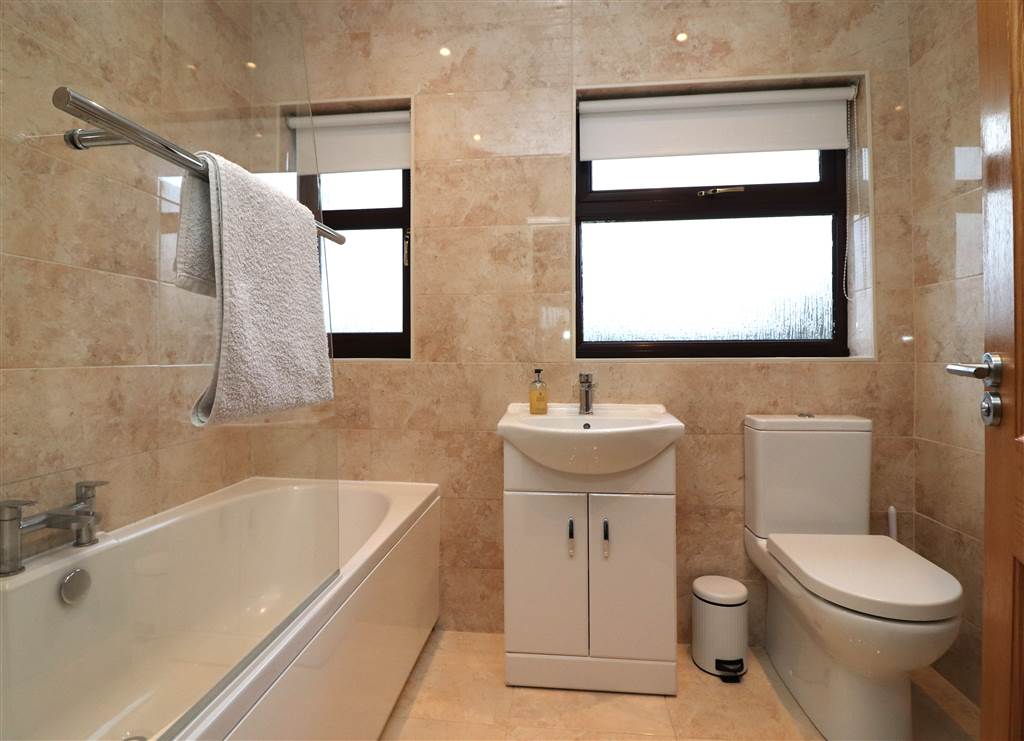 White suite. Panelled bath with mixer taps and shower screen. Vanity unit with wash hand basin. Low flush WC. PVC panelled ceiling with recessed lights. Tiled walls and floor.