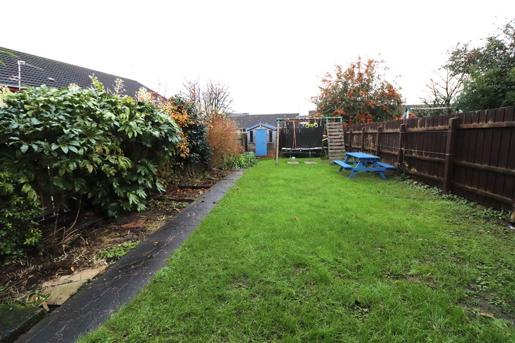 Low maintenance front garden. Completely enclosed side and rear garden in lawn. Two garden stores and garden shed. Outside light and tap.