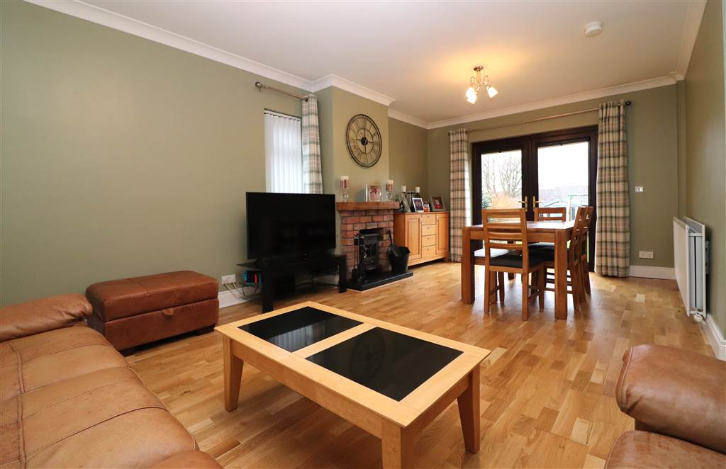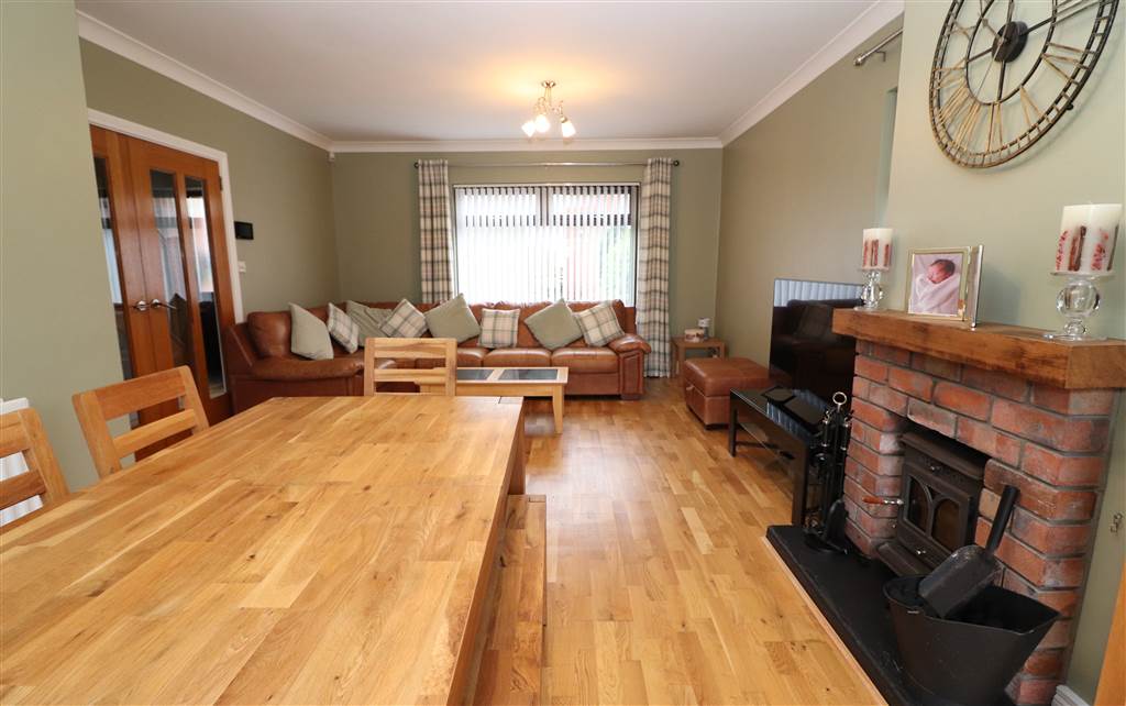 Feature brick fireplace with slate hearth and multi fuel stove. Semi solid flooring. UPVC french doors to rear patio. Coved ceiling.