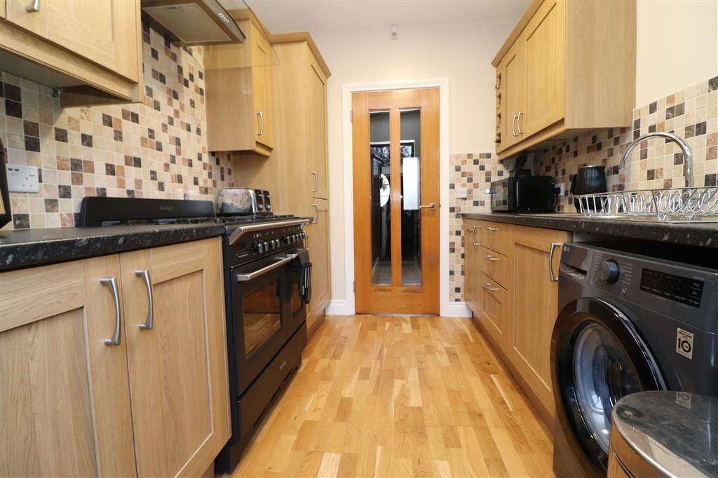 Good range of high and low level units. Extractor fan. Single drainer stainless steel sink unit with mixer taps. Integrated fridge/freezer. Wine rack. Plumbed for washing machine. Part tiled walls. Semi solid flooring. Glazed door from entrance hall.