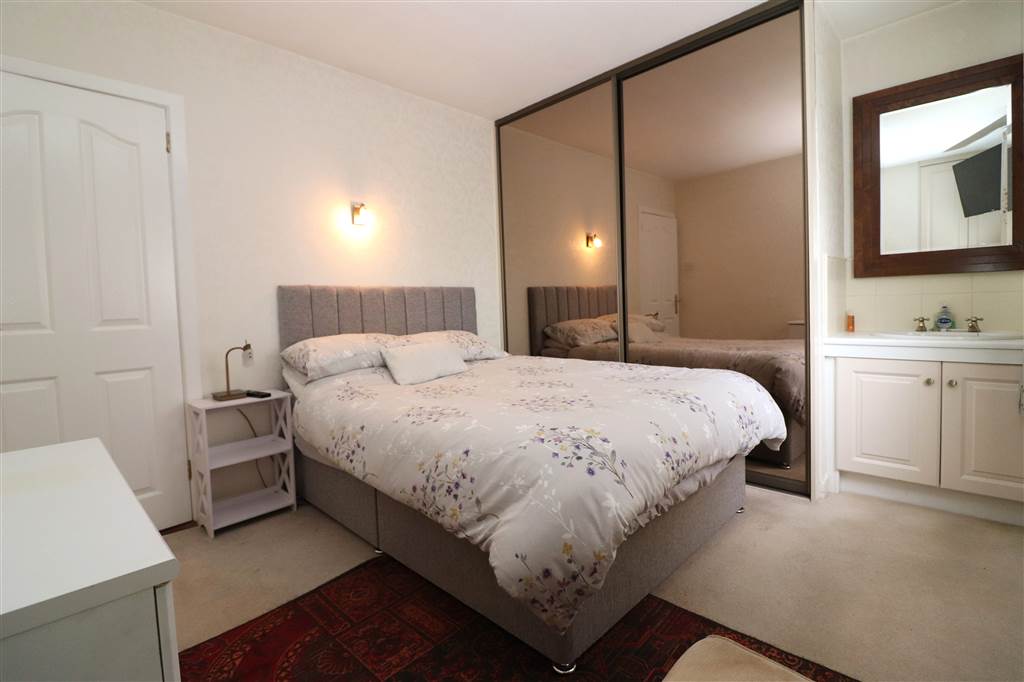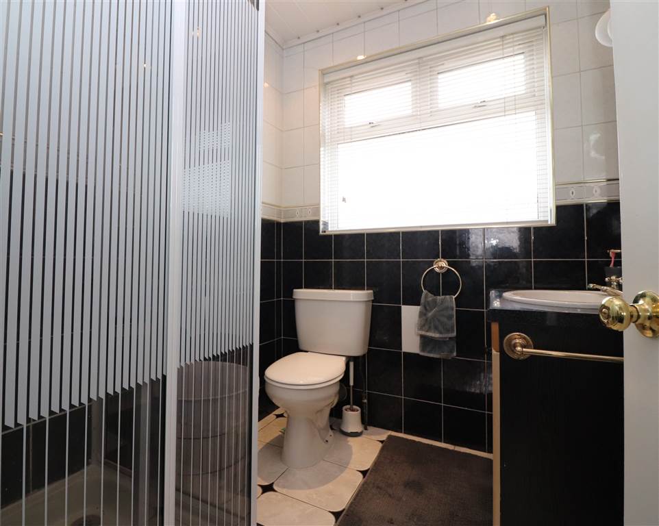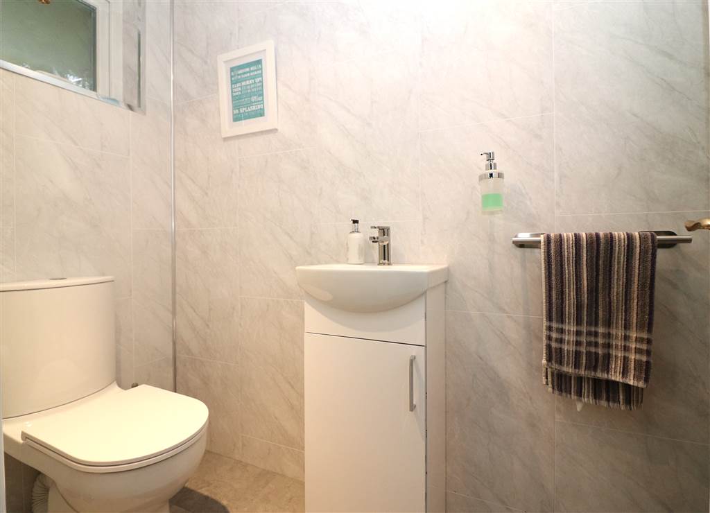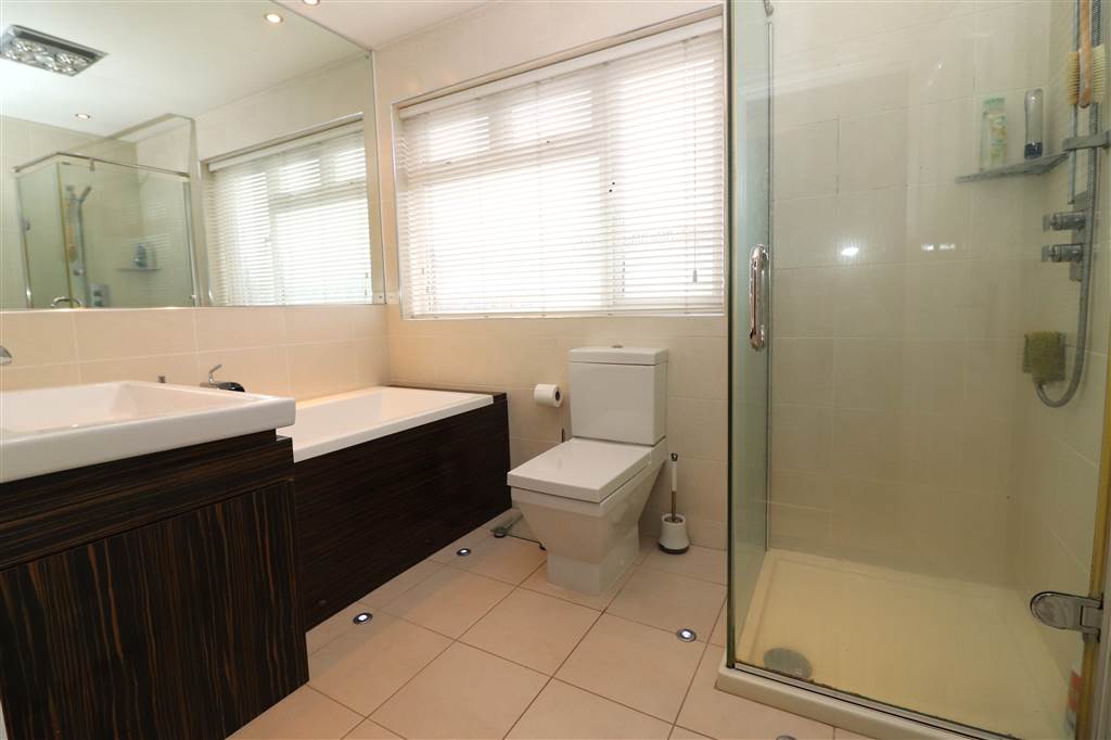 White suite. Bath with mixer taps and shower attachment. Shower cubicle with thermostatically controlled shower. Vanity unit with wash hand basin. Low flush WC. Heated chrome towel rail. Tiled walls and floor. Recessed lights. Airing cupboard.