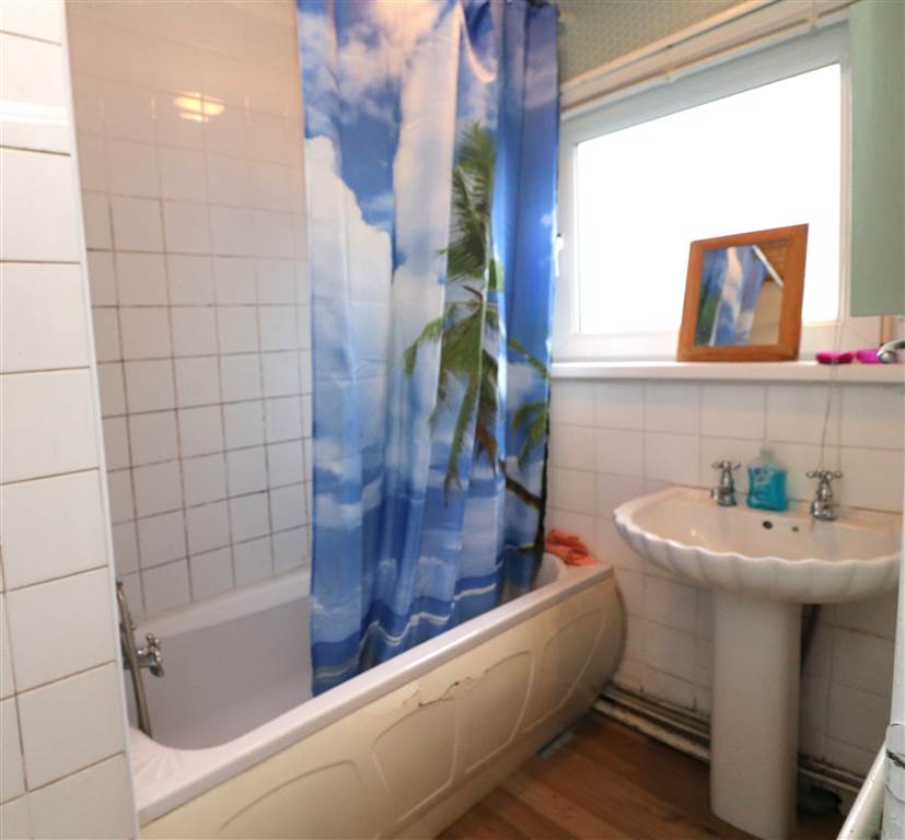 White suite. Panelled bath with thermostatically controlled shower. Pedestal wash hand basin. Storage cupboard. Laminate flooring. Part tiled walls. Wood panelled ceiling.