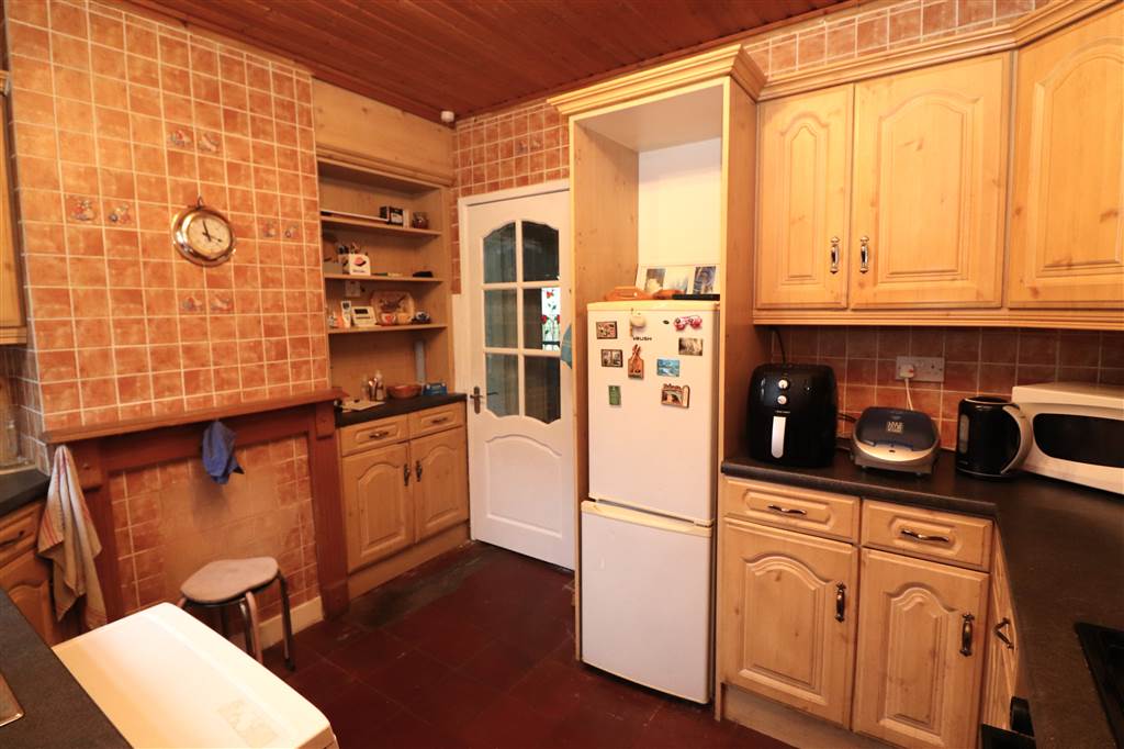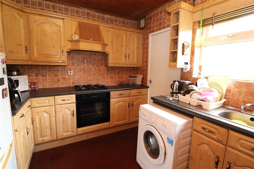 Range of high and low level unitys. Single drainer stainless steel sink unit. Space for fridge/freezer. Plumbed for washing machine. Built in gas hob and electric under oven. Part tiled walls. Tiled floor.