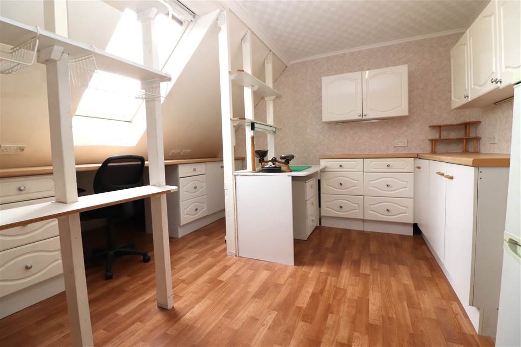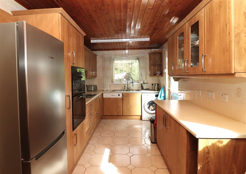 Good range of high and low level units. Pull out larder. Built in hob and double oven. Integrated dishwasher. One and a half bowl stainless steel sink unit with mixer taps. Extractor fan. Pine panelled ceiling. Glazed display cabinets. Part tiled walls, tiled floor.