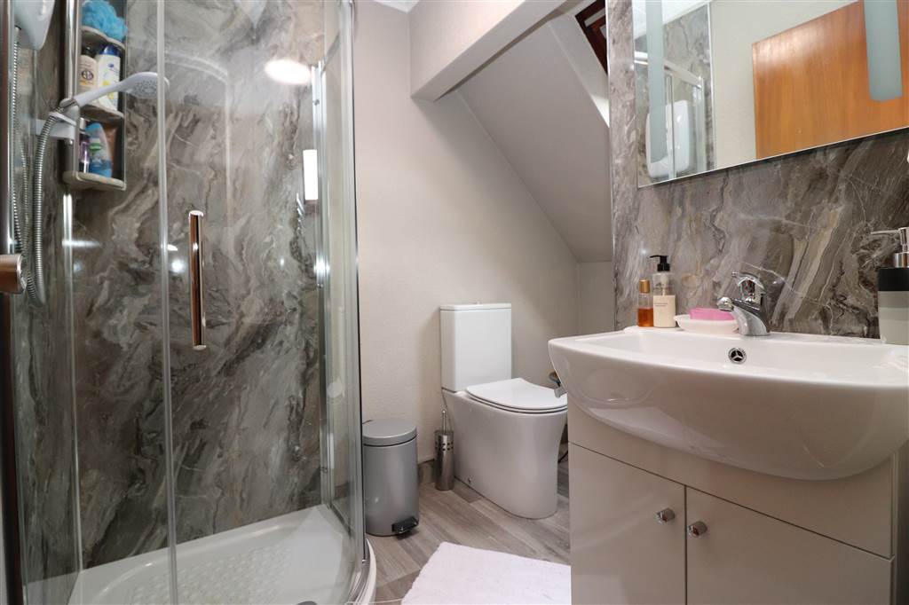 White suite. Shower cubicle with Triton electric shower. Vanity unit with wash hand basin. Low flush WC. Velux window.