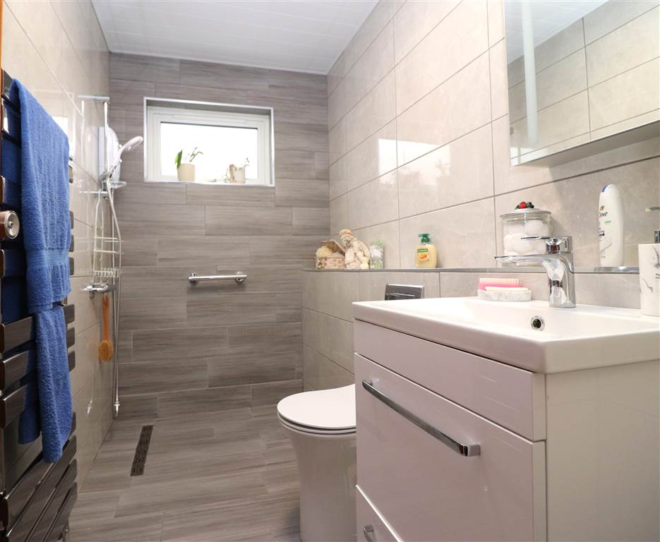 Shower with Triton electric shower. Vanity unit with wash hand basin. WC. Tiled walls and floor. PVC panelled ceiling. Heated chrome towel rail.