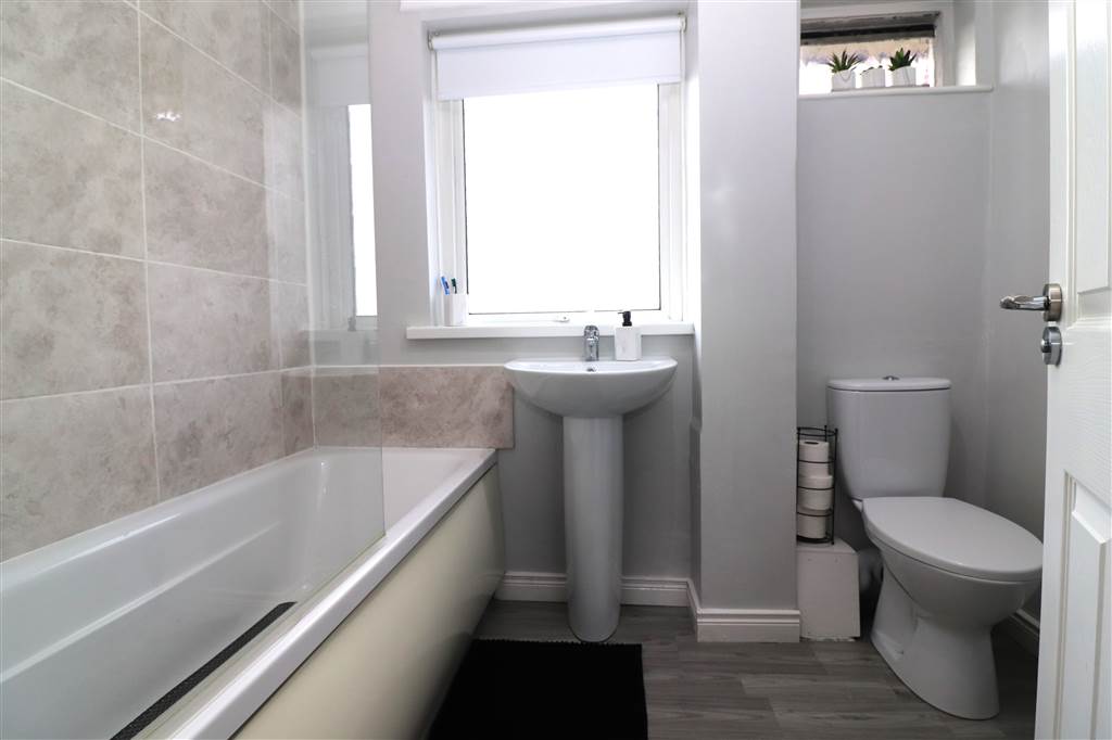 White suite. Panelled bath with mixer taps, thermostatically controlled shower and shower screen. Pedestal wash hand basin. Low flush WC. Part tiled walls. Heated chrome towel rail.