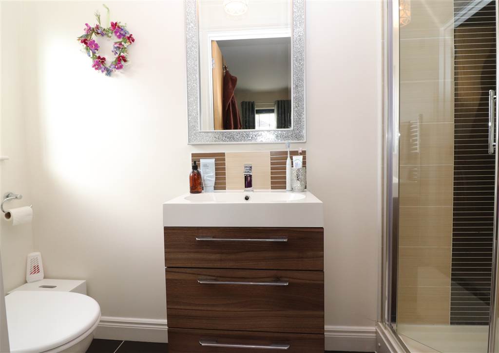 White suite. Shower cubicle with Mira electric shower. Vanity unit with wash hand basin. Low flush WC. Tiled floor. Extractor fan. Part tiled walls.