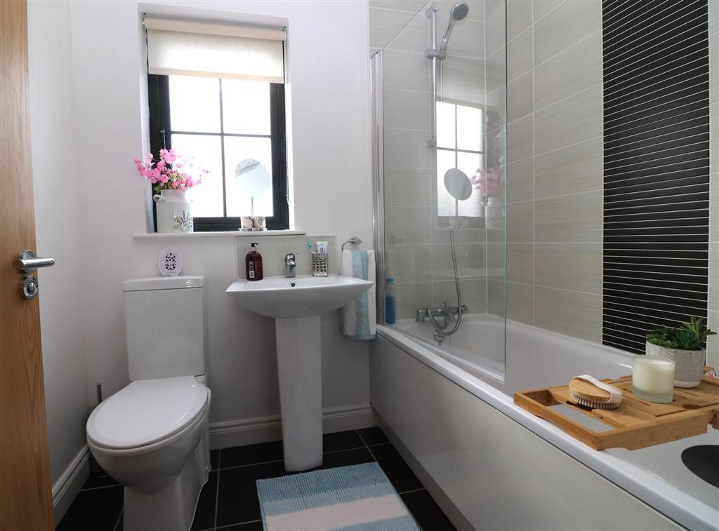 White suite. Panelled bath with mixer taps, shower attachment and shower screen. Pedestal wash hand basin. Low flush WC. Tiled floor. Part tiled walls. Extractor fan.