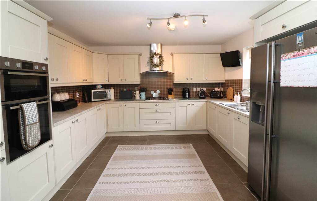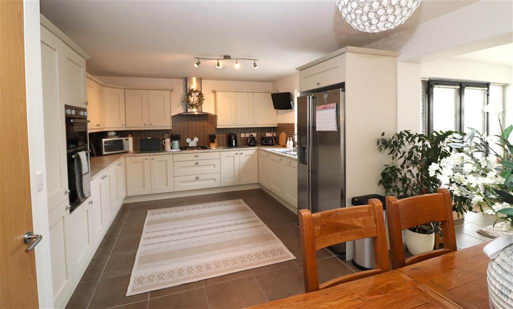 Excellent range of high and low level units. Built in gas hob and Neff electric double oven. Integrated Bosch dishwasher and Beko washing machine. One and a half bowl stainless steel sink unit with mixer taps. American style fridge/freezer. Extractor fan. Tiled floor. Open plan to sun room.