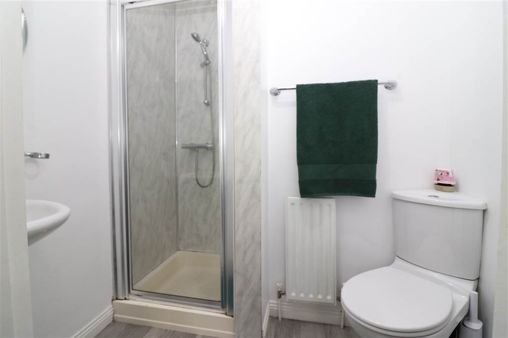 White suite. Shower cubicle with thermostatically controlled shower. PVC wall panelling. Pedestal wash hand basin. Low flush WC. Part tiled walls. Tiled floor.