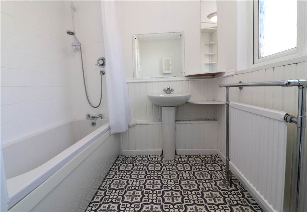 White suite. Panelled bath with shower. Pedestal wash hand basin. Low flush WC. Part tiled and wood panelled walls.