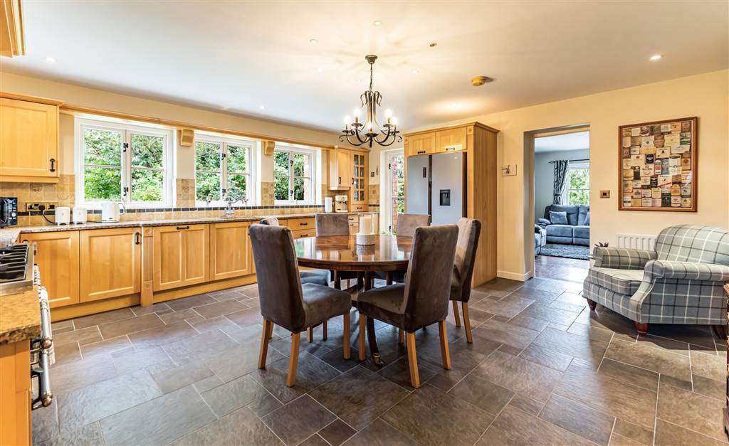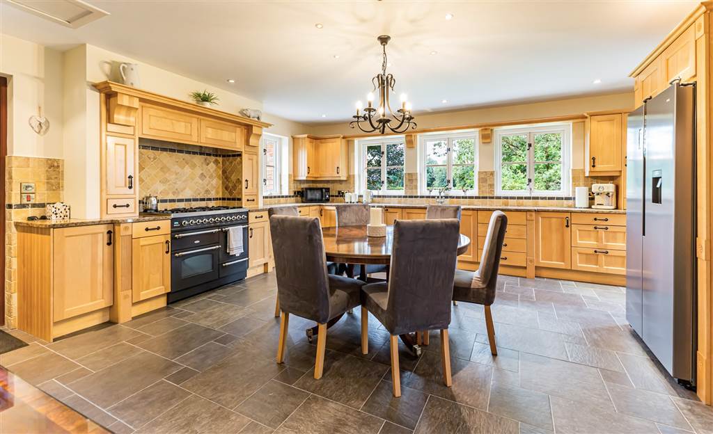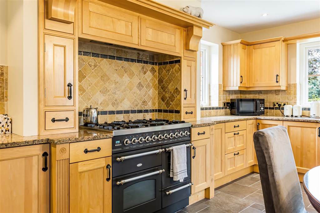 Excellent range of solid maple high and low level units with granite worktops. One and a half bowl sink unit with mixer tap. Brittania range cooker with 6 gas rings, grill, 2 ovens and warming drawer. Extractor fan. Glazed display cabinets. Logik American style fridge/freezer. Integrated dishwasher. Tiled floor. Part tiled walls. Recessed lights.