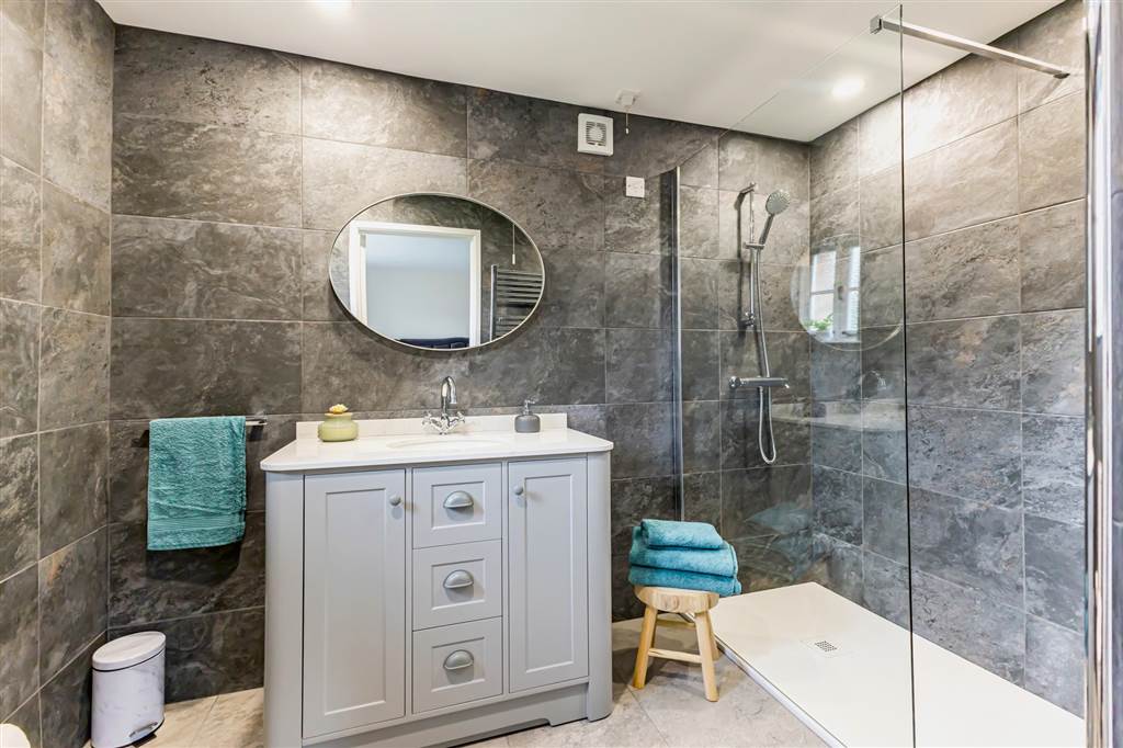 White suite. Large shower cubicle with thermostatically controlled shower. Vanity unit with marble top and wash hand basin. Low flush WC. Tiled walls and floor. Extractor fan. Recessed lights. Chrome heated towel rail.