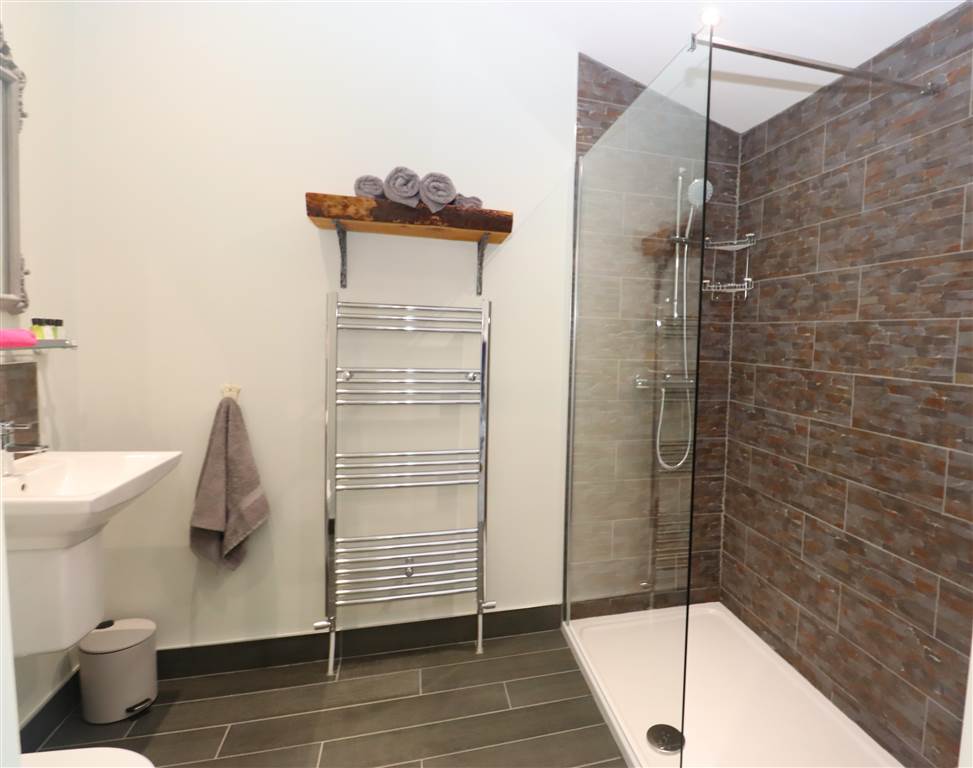 White suite. Large shower cubicle, floating wash hand basin, low flush WC, part tiled walls, heated chrome towel rail. Feature tiled flooring.