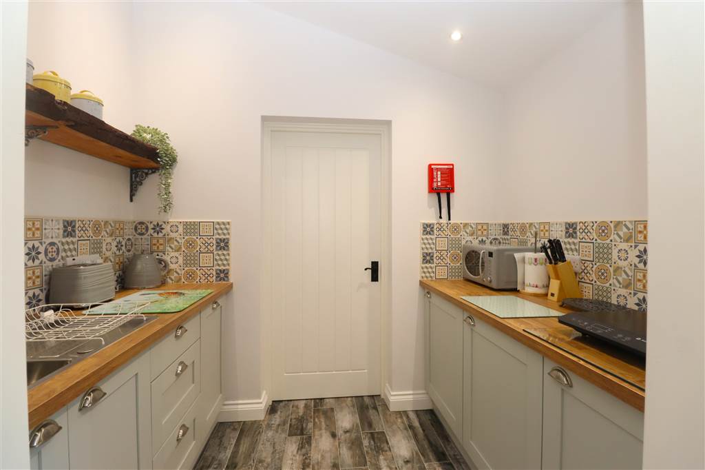 Range of high and low level units. Single drainer stainless steel sink unit with mixer taps. Plumbed for washing machine. Recessed lights. Oil fired boiler. Access to pantry. Tiled floor.