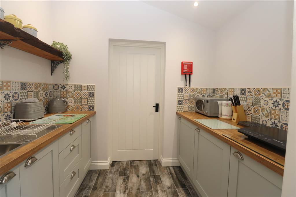 Range of high and low level units. Single drainer stainless steel sink unit with mixer taps. Slimline integrated dishwasher. Recessed lights. Extractor fan. Part tiled walls. Feature tiled flooring.