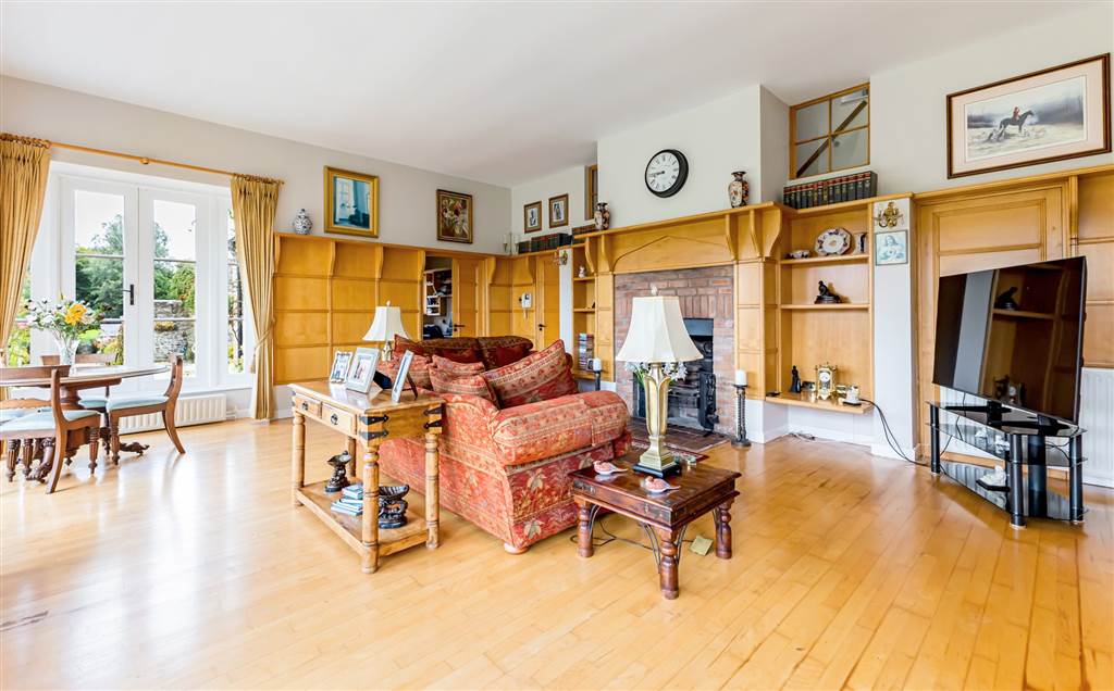 Feature Inglenook fireplace with dog basket grate. Junkers solid maple flooring and stunning maple wall panelling. Recessed lights. French doors to garden. French doors to home office.