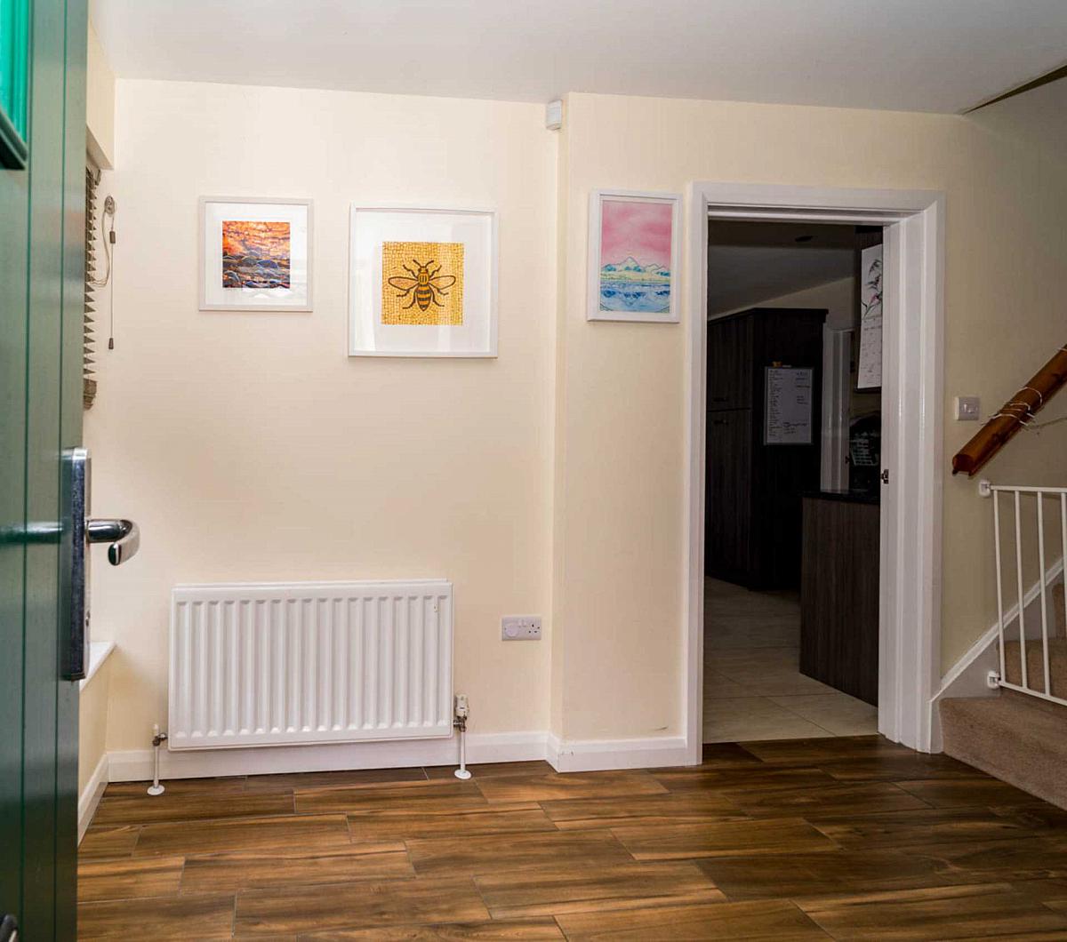 Part glazed entrance door. Tiled floor. Downlighters in chrome.