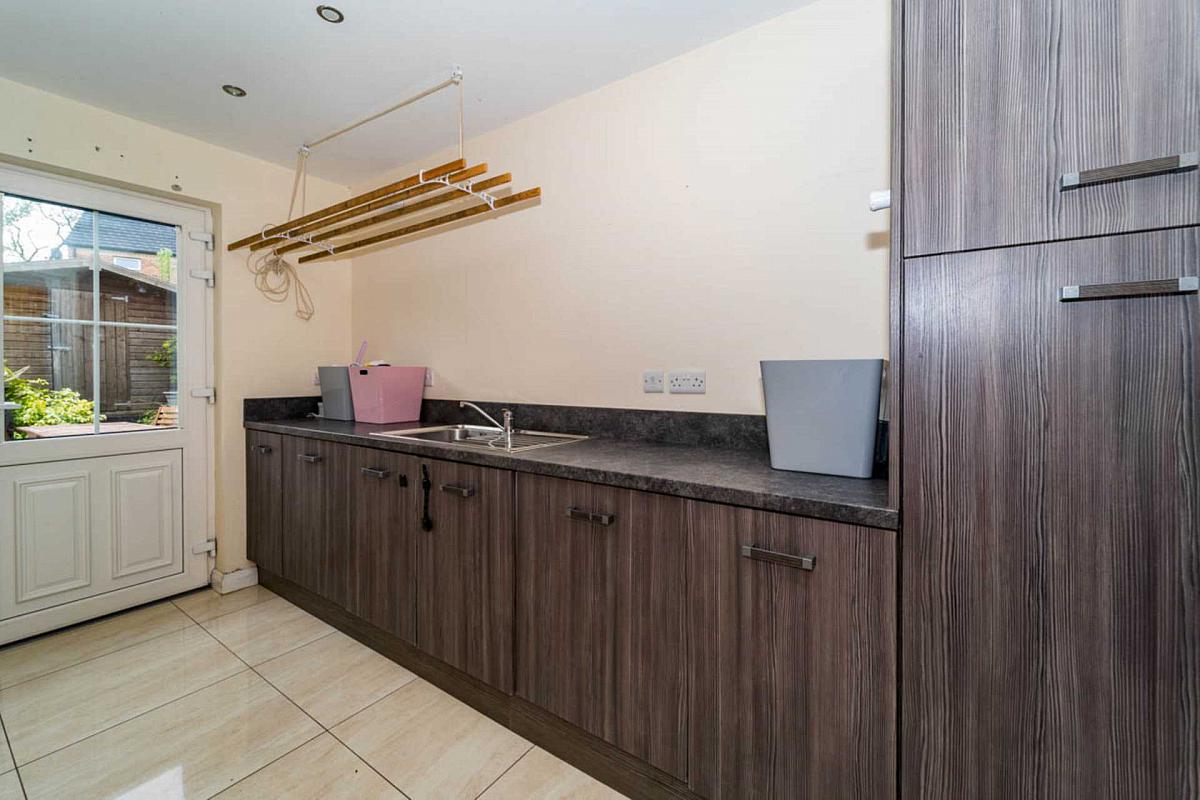 Range of matching cupboards. Single drainer stainless steel sink unit with mixer tap. Integrated washing machine and tumble dryer. Tiled floor. Downlighters in chrome. uPVC double glazed rear door.