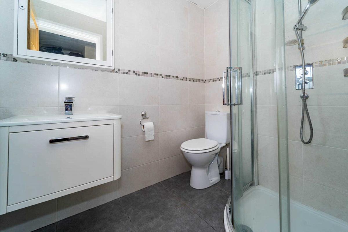 Chrome heated towel rail. Downlighters in chrome. Tiled floor and fully tiled walls.