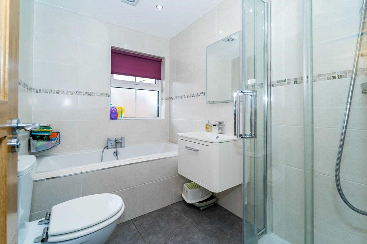 Suite comprising tile panelled bath centred mixer tap and shower attachment; corner shower cubicle with drench head shower and hose attachment; floating vanity wash hand basin with mixer tap; low flush w.c. Chrome heated towel rail. Tiled floor and fully tiled walls.