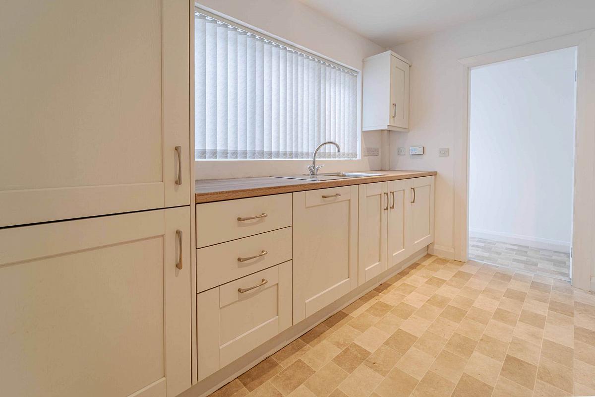 Range of "Shaker" style high and low level units. Single drainer stainless steel sink unit with mixer tap. Built-in oven,4 ring touch hob and extractor unit over in stainless steel. Integrated dishwasher, fridge freezer and washing machine. Downlighters in chrome.