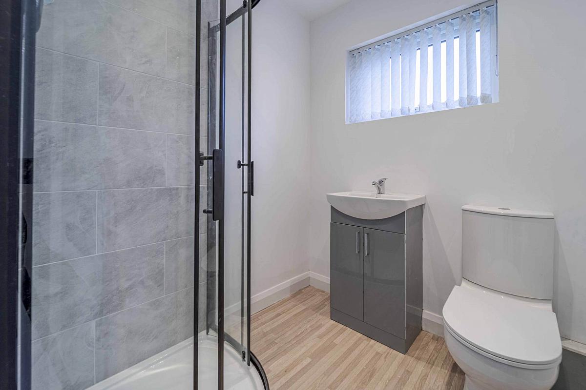 White suite to include corner shower; vanity wash hand basin with mixer tap; and low flush w.c. Downlighters.