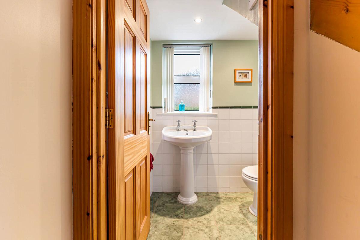 Pedestal wash hand basin and low flush w.c. `Karndean` flooring. Part tiled walls.
