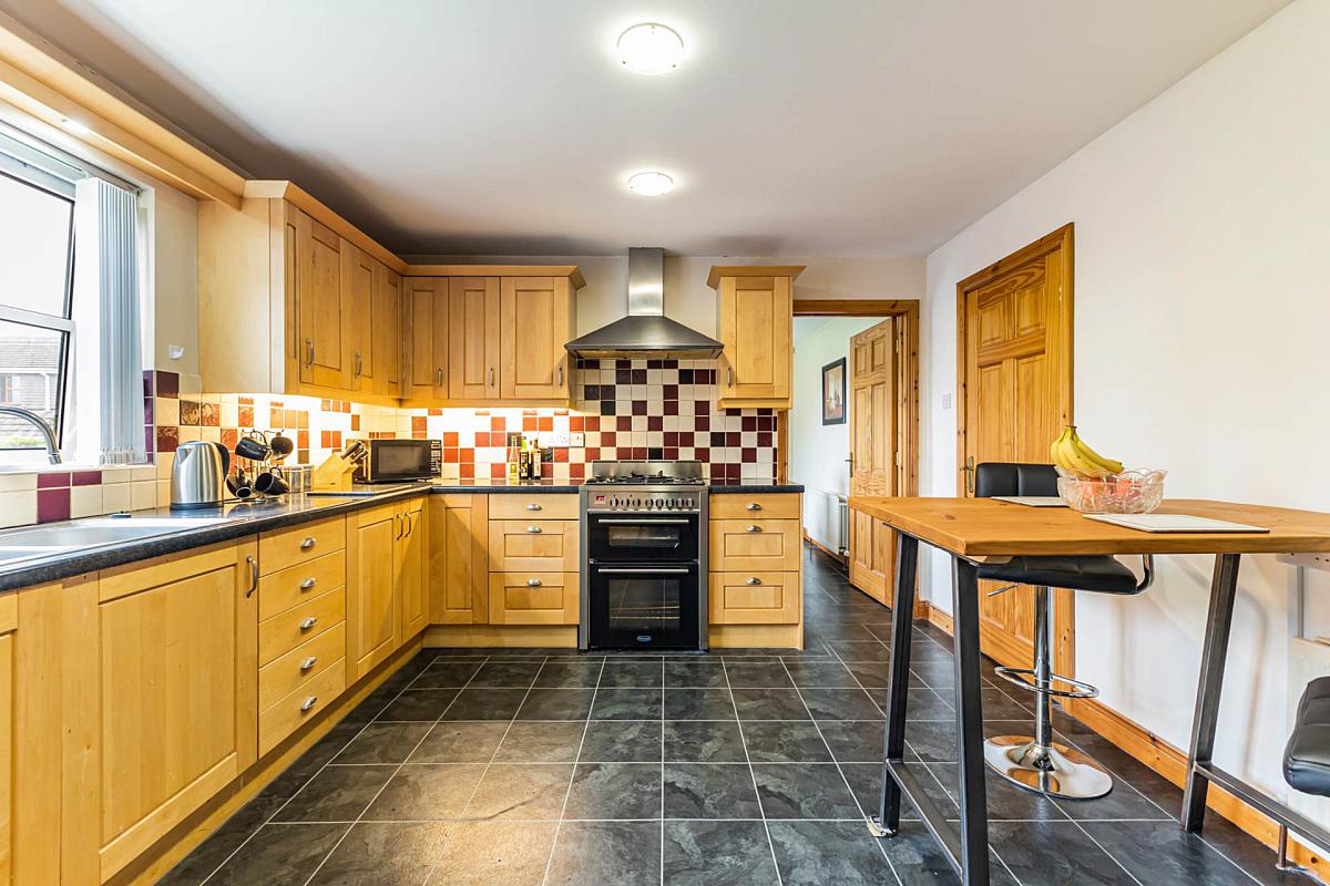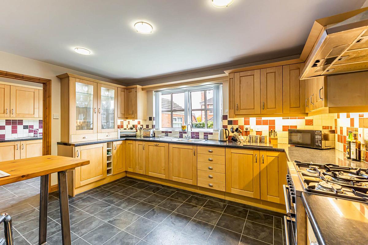 Extensive range of `Shaker` style units in maple. Large and small bowl single drainer stainless steel sink unit with mixer tap. Integrated dishwasher, fridge and freezer. Extractor fan in stainless steel. Part tiled walls. `Karndean` flooring.