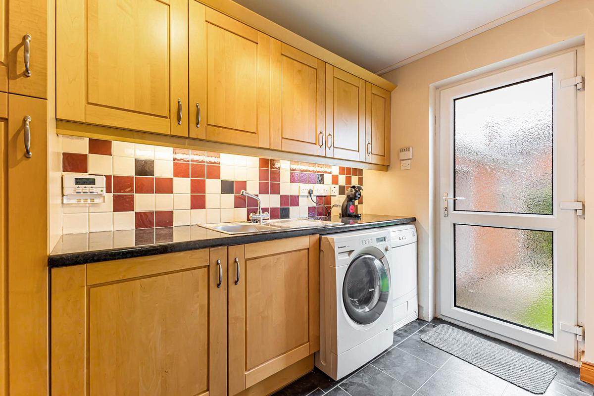 Fitted high and low level matching cupboards. Single drainer stainless steel sink unit with mixer tap. Plumbed for washing machine. Part tiled walls. `Karndean` flooring. uPVC double glazed rear door.