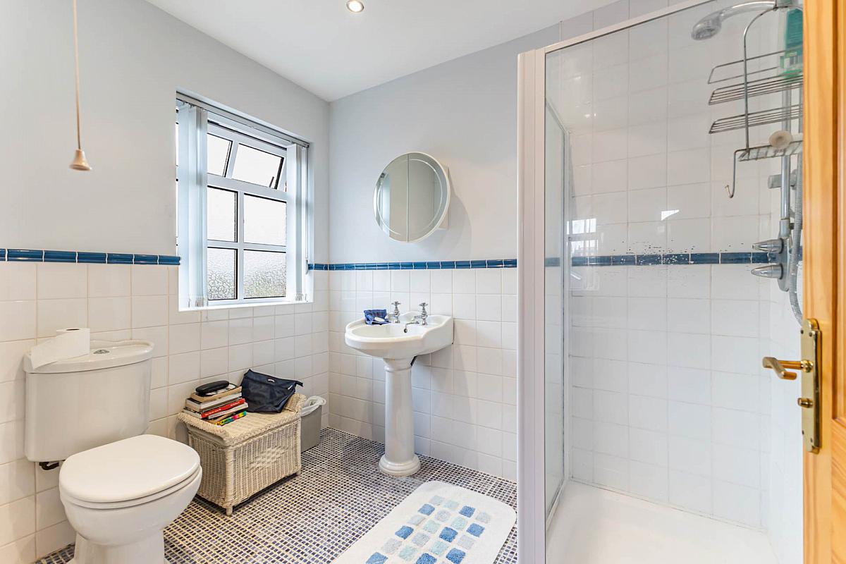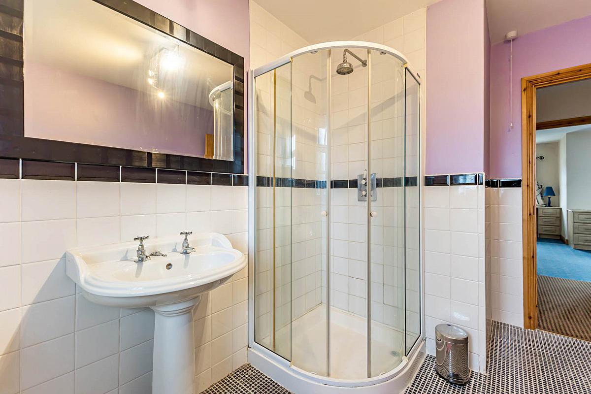 Fully tiled shower cubicle, pedestal wash hand basin; and low flush w.c. Tiled floor. Part tiled walls.