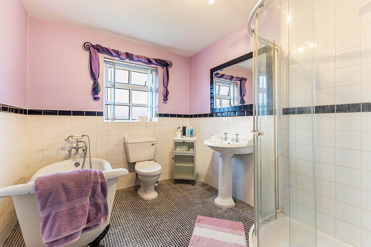 Luxury white suite comprising free standing claw foot bath with mixer tap and shower attachment; pedestal wash hand basin; and low flush w.c. Fully tiled shower cubicle. Tiled floor. Part tiled walls.