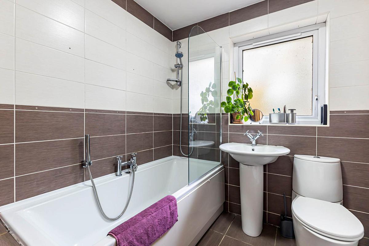 White suite comprising bath with centred mixer taps and shower attachment; separate shower unit over bath with shower screen; pedestal wash hand basin with mixer tap; low flush wc. Fully tiled walls and tiled floor. Extractor fan.
