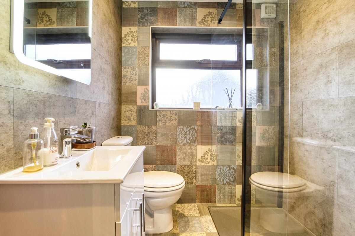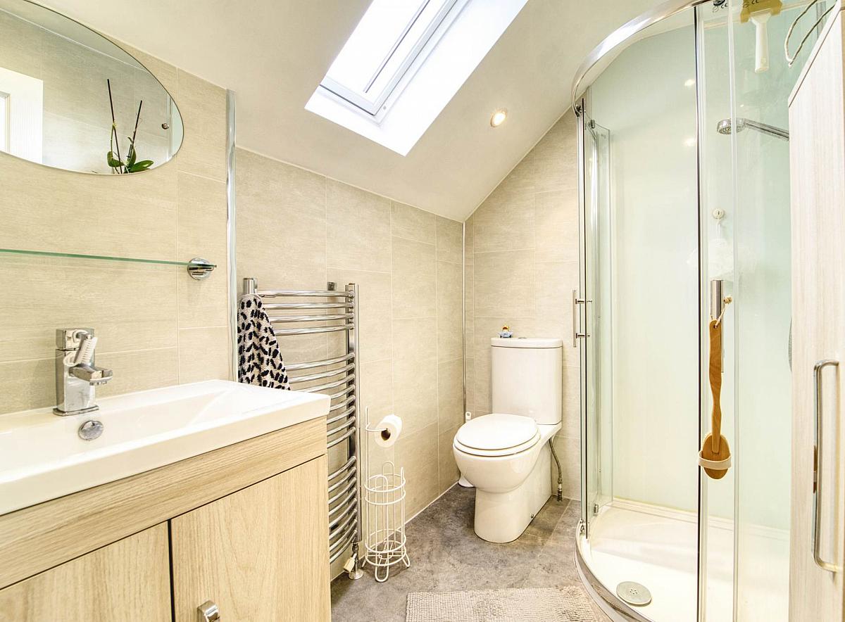 Refitted to include walk in shower, wc, wash hand basin. Panelled walls, ceiling and floor. Extractor fan. Heated towel rail.