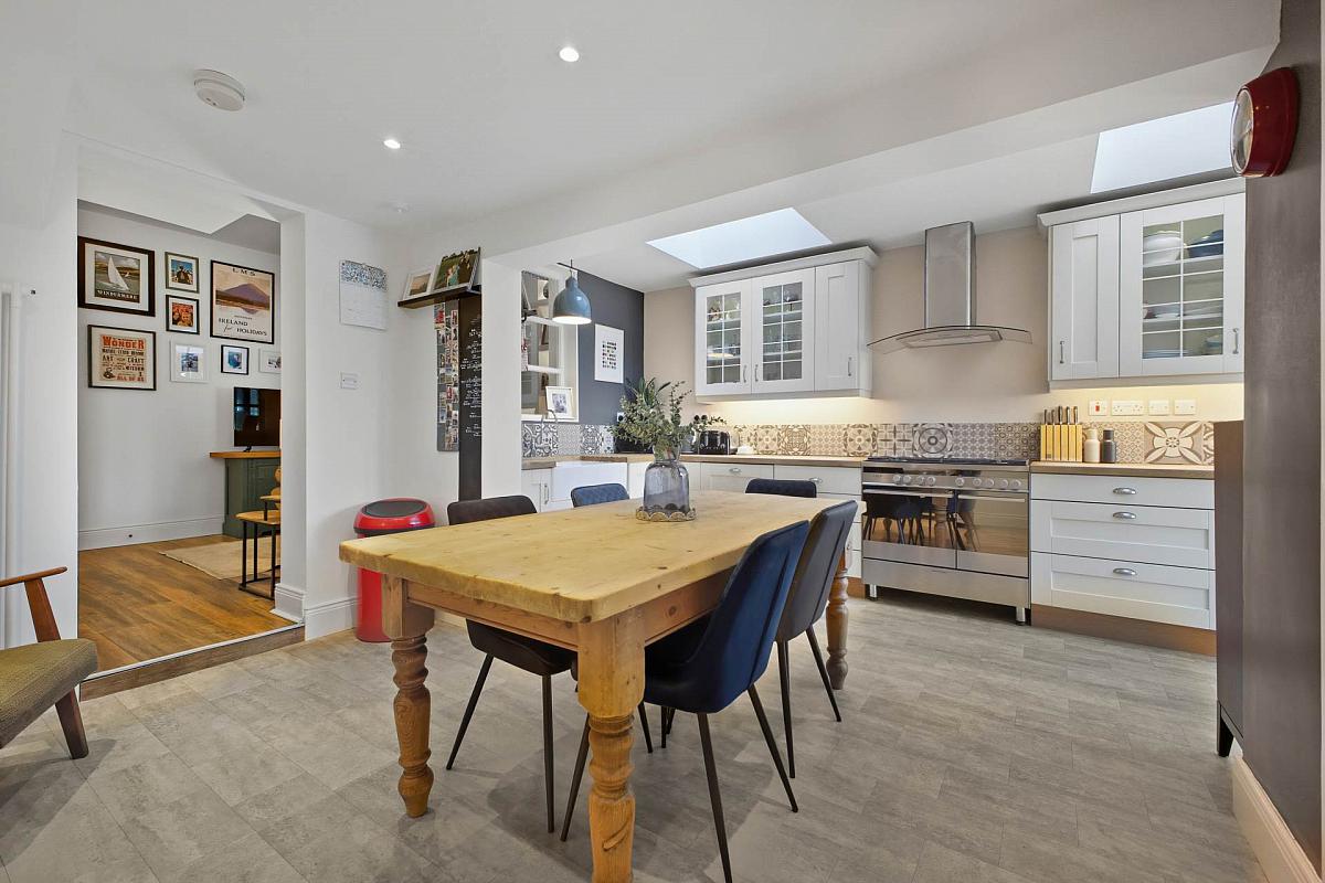 Range of high and low level cupboards with underlighting. Belfast sink with mixer tap. Integrated dishwasher and fridge. Range style cooker with extractor unit over. Downlighters. Feature radiator. uPVC double glazed 'French' doors.
