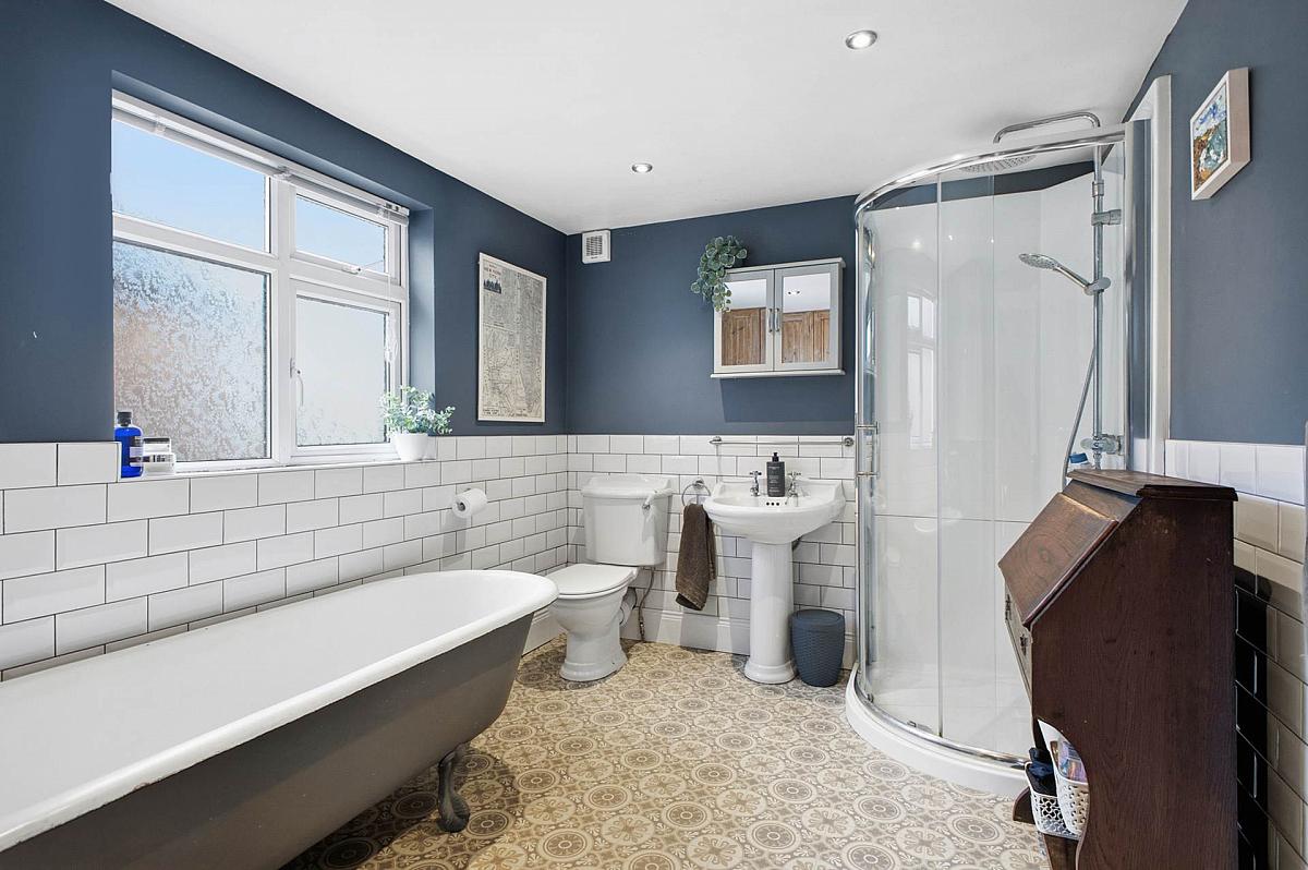 Roll top claw foot bath with mixer tap and telephone shower attachment; pedestal wash hand basin; low flush w.c. and corner shower cubicle with drench head shower and hose attachment. Part tiled walls. Downlighters.