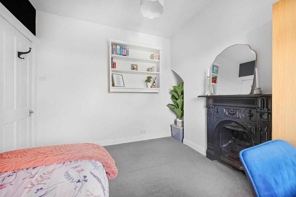 Cast iron fireplace with slate hearth. Corniced ceiling and centre rose. Laminate wooden floor.