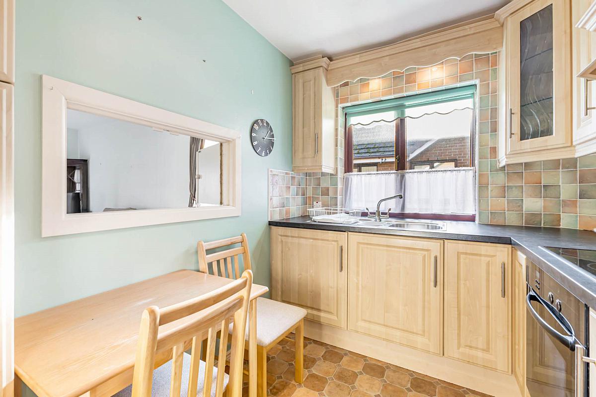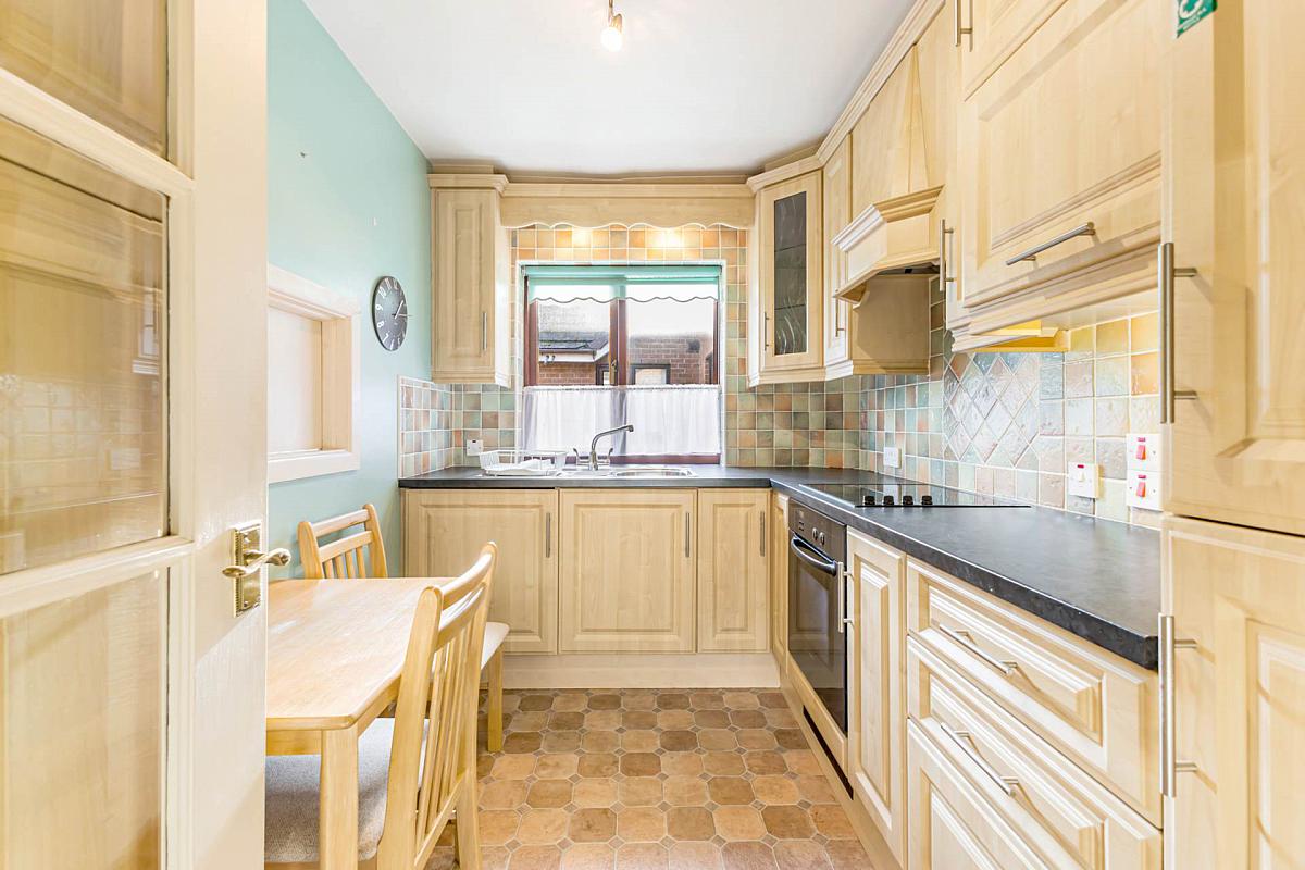 Range of high and low level cupboards. Single drainer stainless steel sink unit with mixer tap. Part tiled walls. Integrated fridge freezer and washer dryer. Built-in oven, hob and extractor fan over.