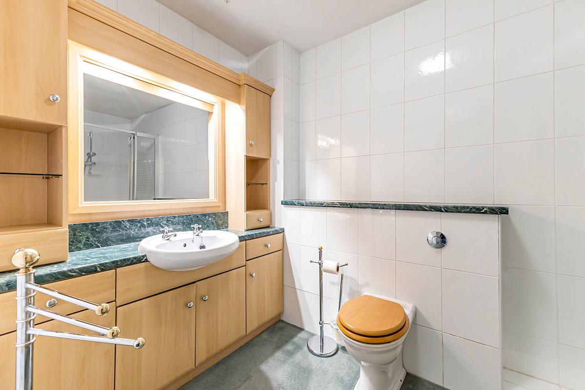 Fully tiled shower enclosure with electric shower; vanity wash hand basin with cupboards and drawers below and to sides and fitted lit mirror; low flush w.c. Fully tiled walls.