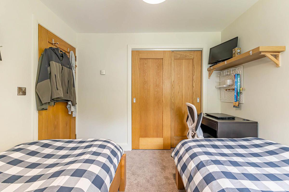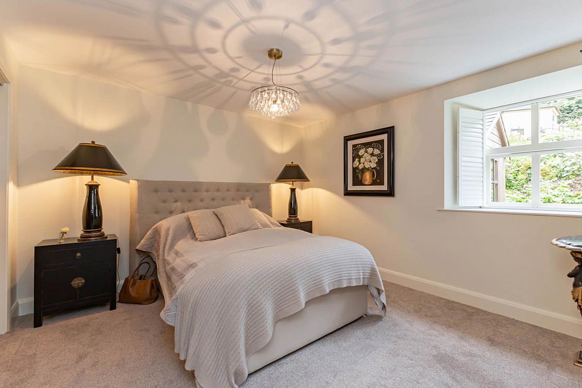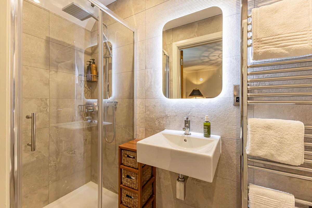 Refitted suite to include spacious shower enclosure with drench head and separate shower attachment. floating wash hand basin with mixer tap. Heated chrome towel rail. Fully tiled walls. Tiled floor. Extractor fan. Downlighters.