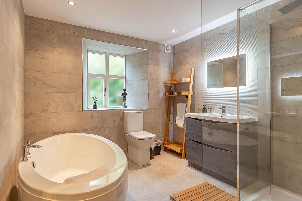 Refitted white suite to include free standing bath with mixer taps; floating vanity wash hand basin with mixer tap and drawer storage below; Large walk in shower enclosure with drench head and separate shower attachment; low flush w.c. Heated chrome towel rail. Fully tiled walls. Tiled floor. Extractor fan. Downlighters.