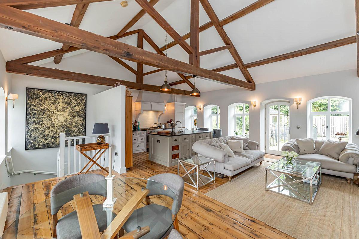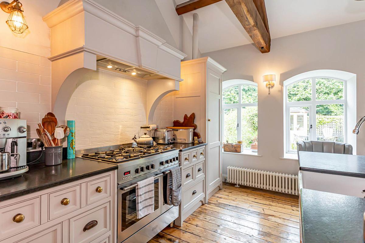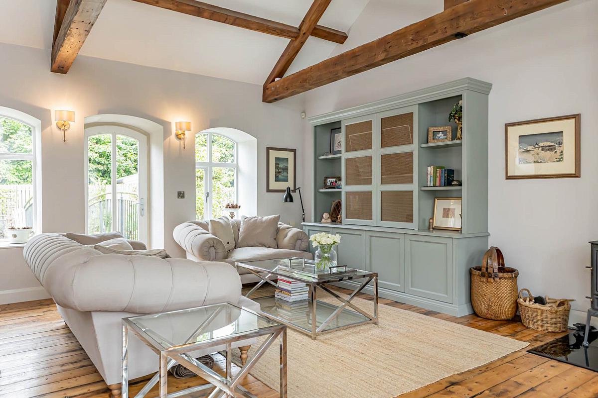 Vaulted ceiling with exposed oak beams. Double aspect arched windows with deep reveals. Multi fuel stove with glass hearth. Wall lights. Lighting over island. Built in wall cabinet with housing for TV and storage. Wooden flooring. Back door.
