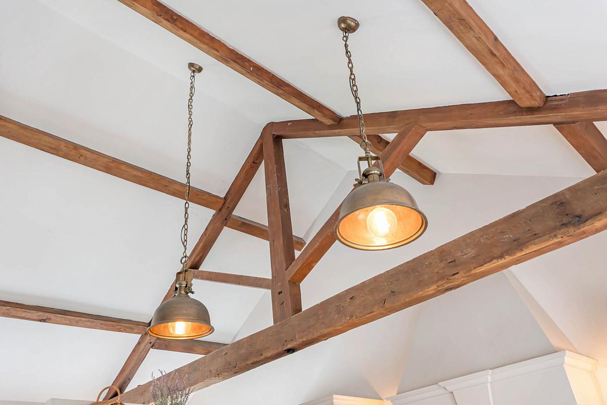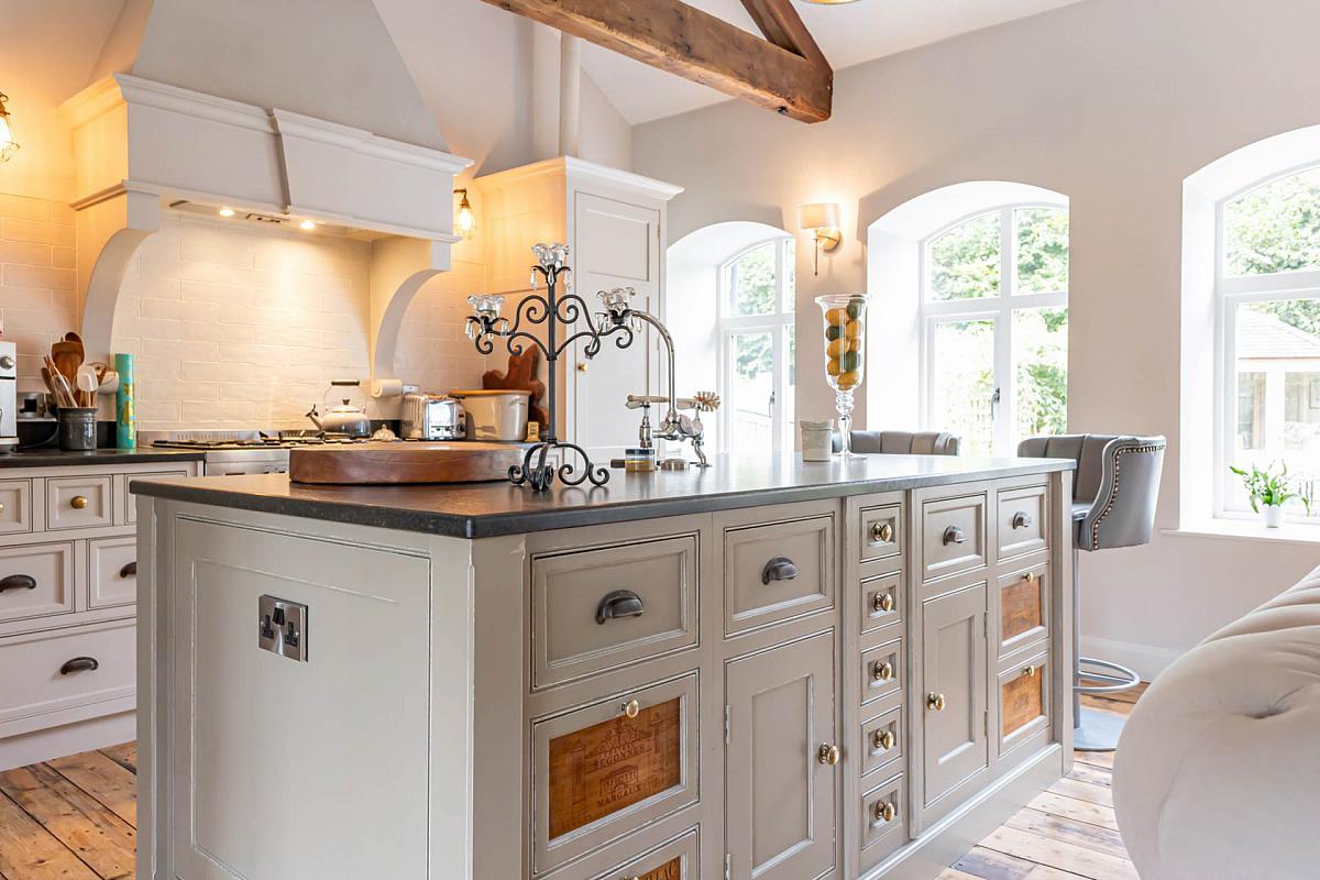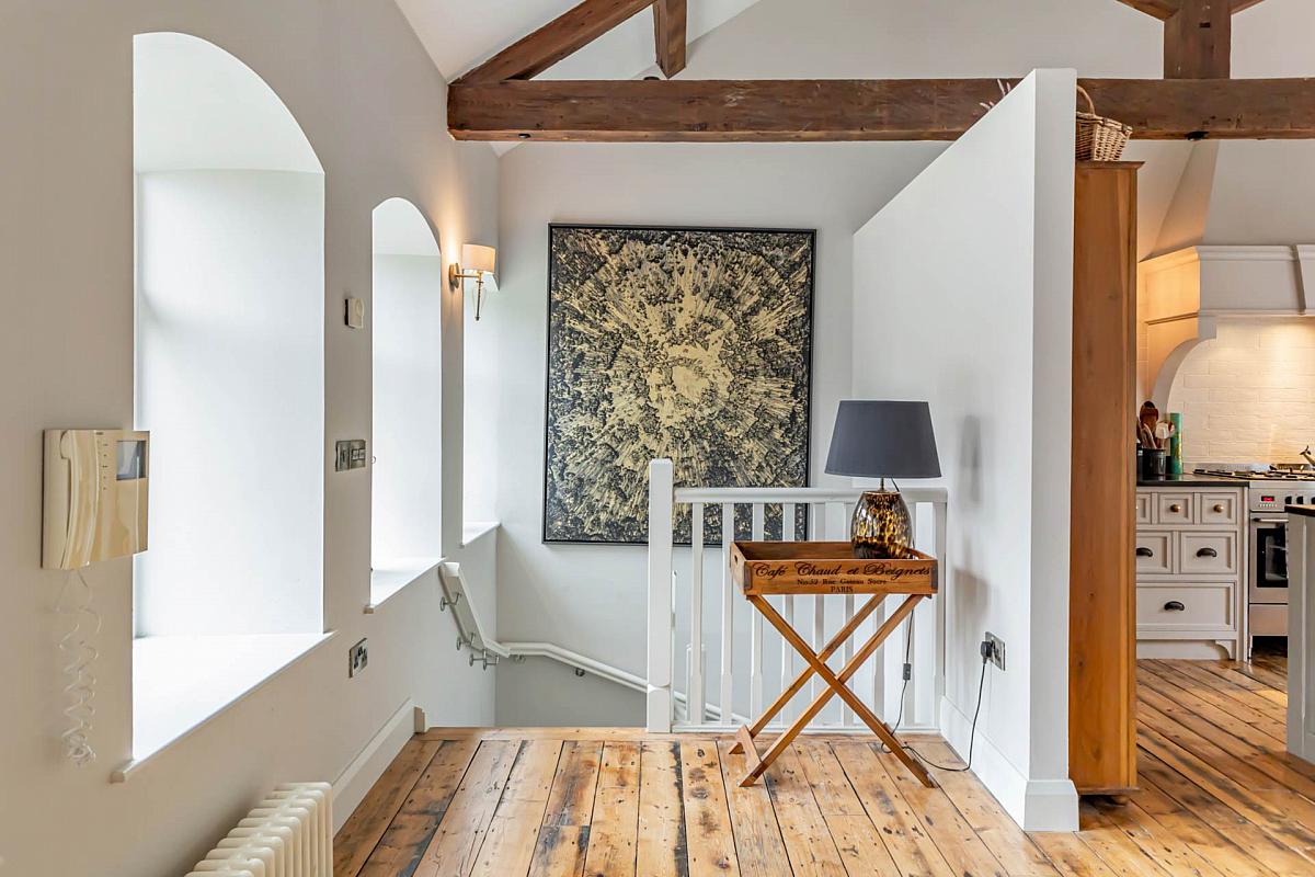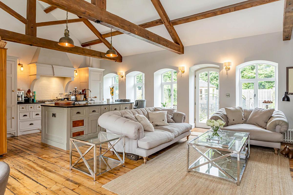 Vaulted ceiling with exposed oak beams. Double aspect arched windows with deep reveals. Multi fuel stove with glass hearth. Wall lights. Lighting over island. Built in wall cabinet with housing for TV and storage. Wooden flooring. Back door.