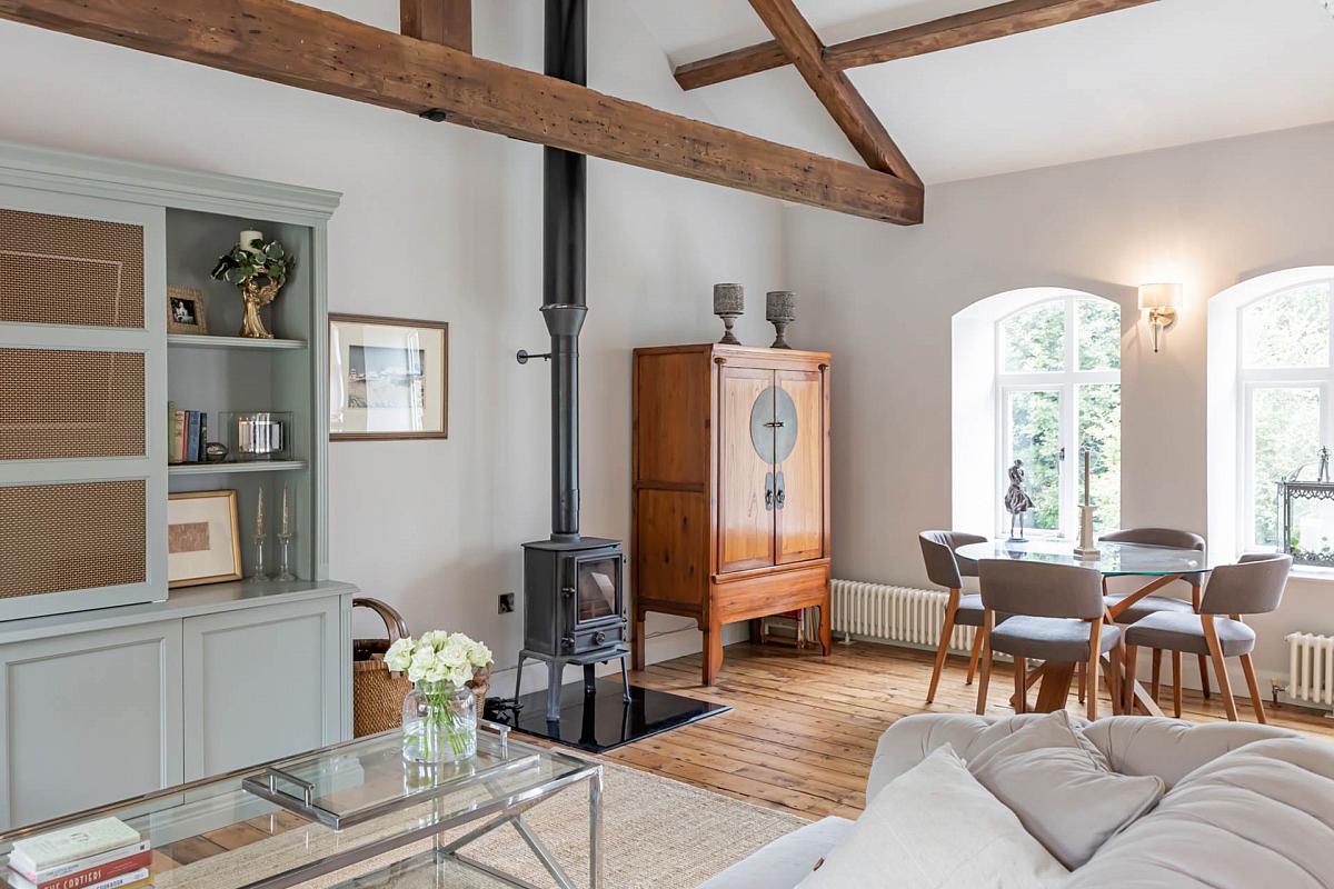 First floor: Spacious and airy open plan Living/Dining/Kitchen area with feature high vaulted ceiling with exposed rafters and a multi-fuel stove. Access to garden via bridged walk-way.