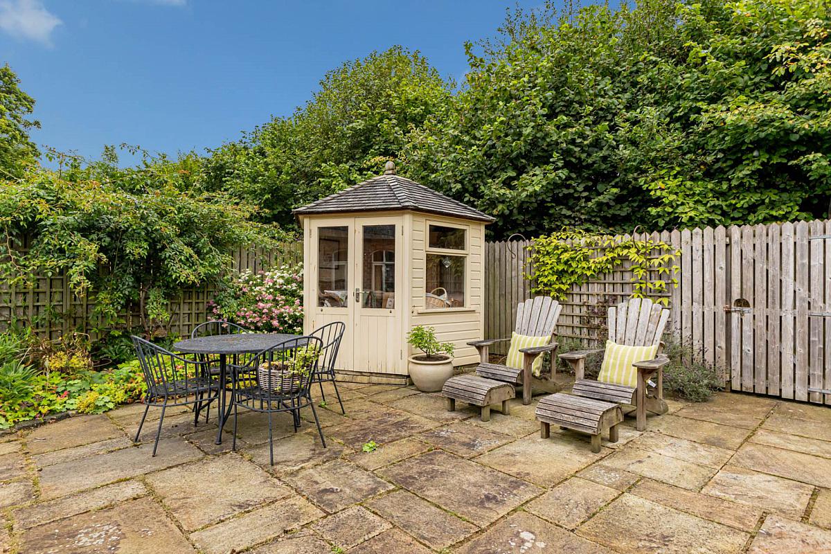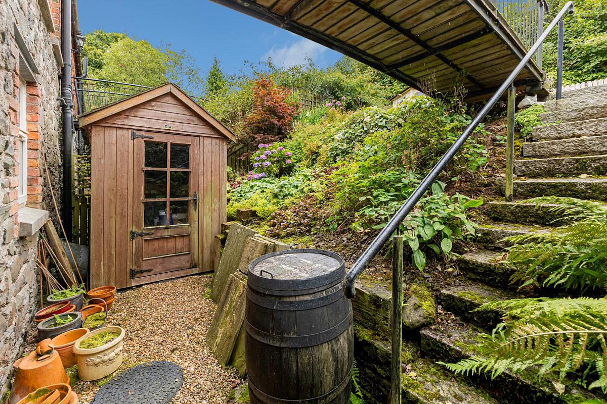 Outside: Front garden laid to lawn with double width designated parking. Delightful bridged walk-way from Living Room to an enclosed paved garden with shrub bed borders and fence surround. Granite steps down to lower garden with timber storage/potting shed. Summer house. Outside lighting and sockets. Tap.