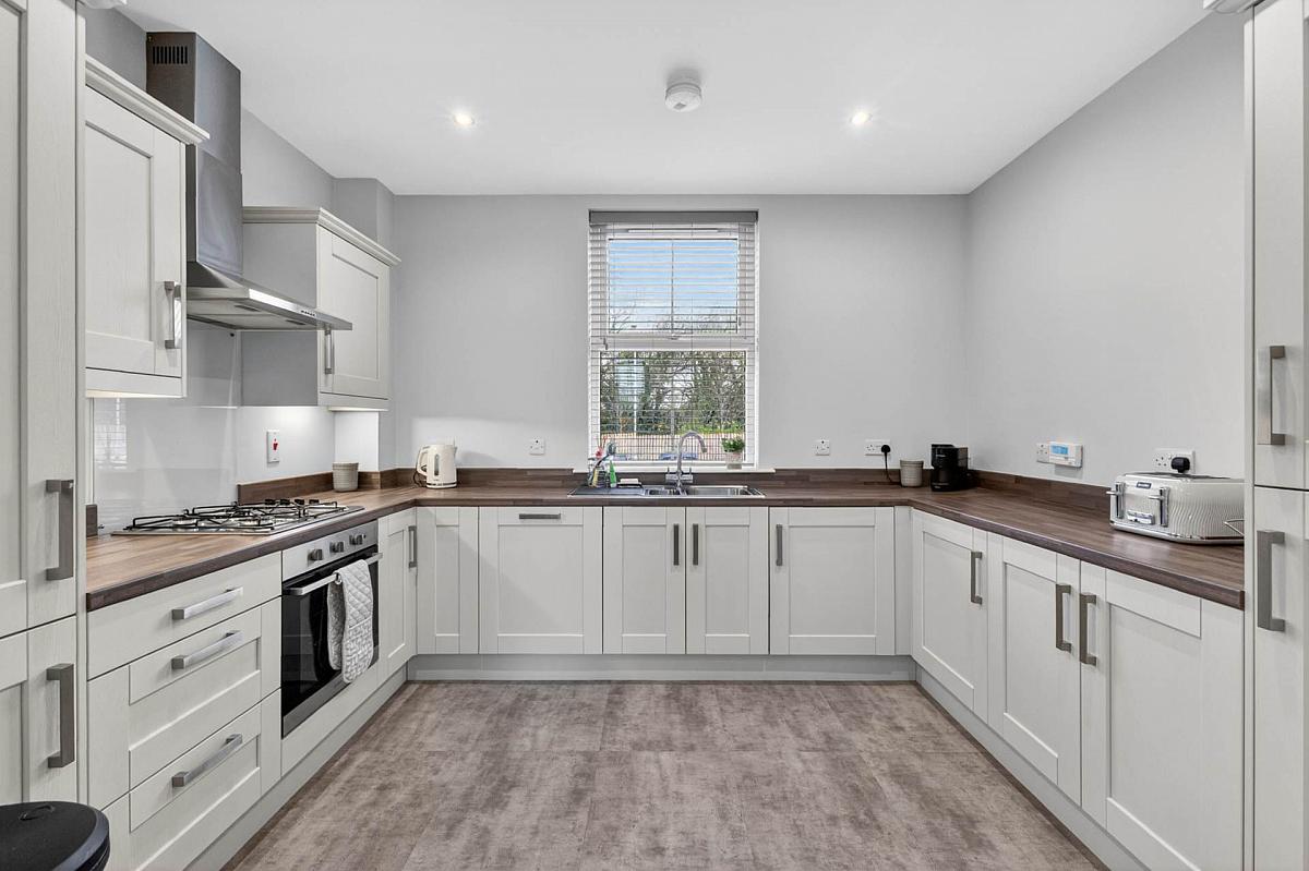 Range of high and low level units with upstands. Built-in oven and 4 ring gas hob with stainless steel chimney hood over. Large and small bowl stainless steel sink unit with mixer tap. Integrated washer/dryer. Intergrated dishwasher and fridge freezer. Downlighters. Laminate wooden floor.