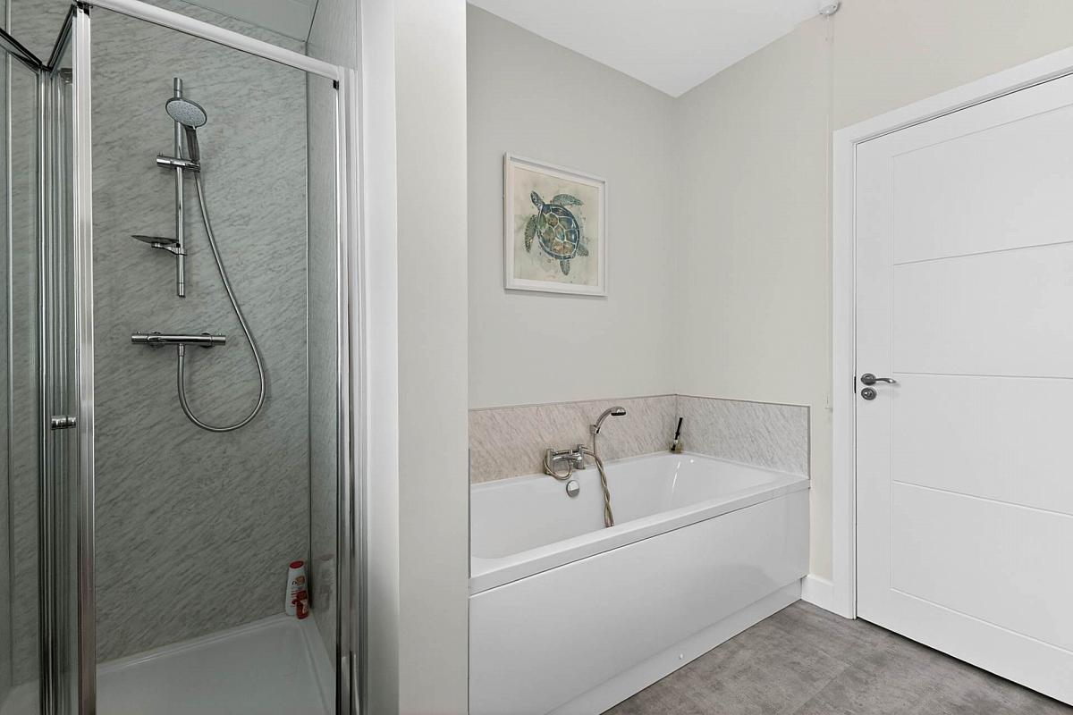 White suite to include panelled bath with mixer tap and telephone shower attachment; separate shower enclosure with panelled walls; pedestal wash hand basin with mixer tap; and w.c. Heated towel rail. Storage cupboard with radiator. Extractor fan. Laminate wooden floor.